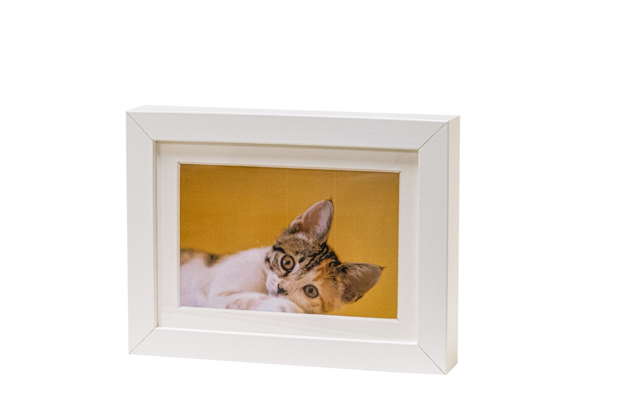 Diese weiße Bilderrahmenurne ist zum Aufstellen und für eine Wandaufhängung geeignet.