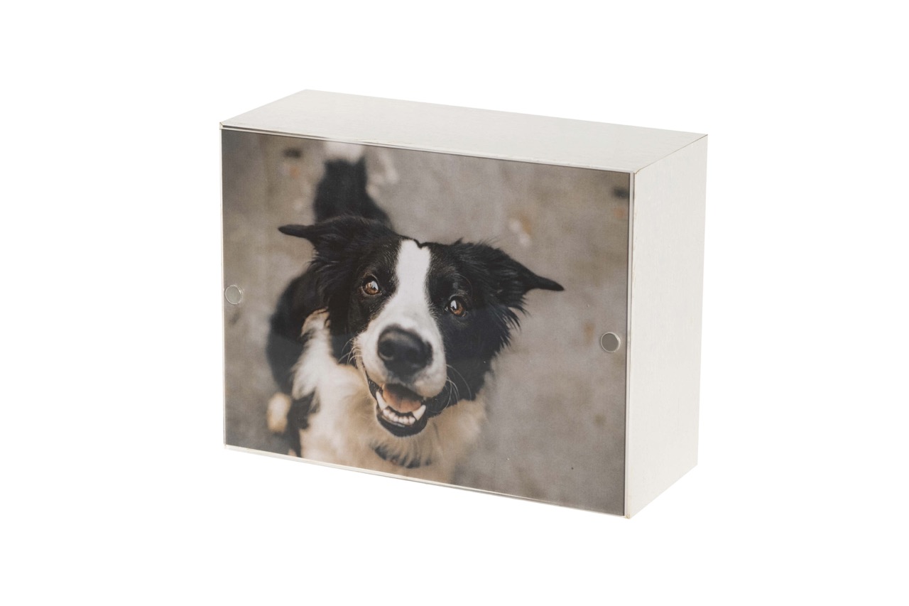 Das Wechseln des Bildes ist bei diese Urne sehr einfach. Die Urne kann im Hoch- oder Querformat (je nach Foto) aufgestellt werden.