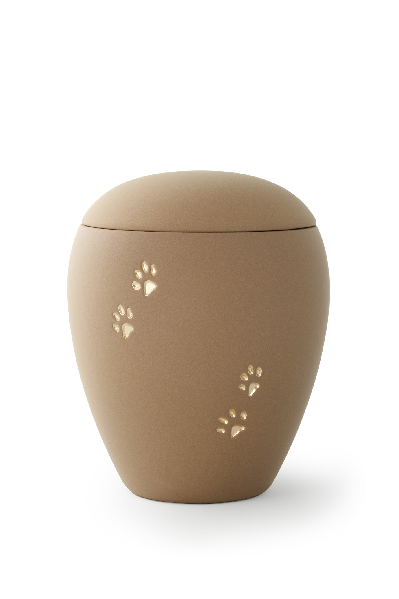 Die braune Keramikurne mit samtiger Oberfläche ist mit 4 von Hand bemalten goldenen Relief-Pfoten verziert. Diese Urne gibt es auch mit 0,5 Liter und 2,8 Liter Volumen.