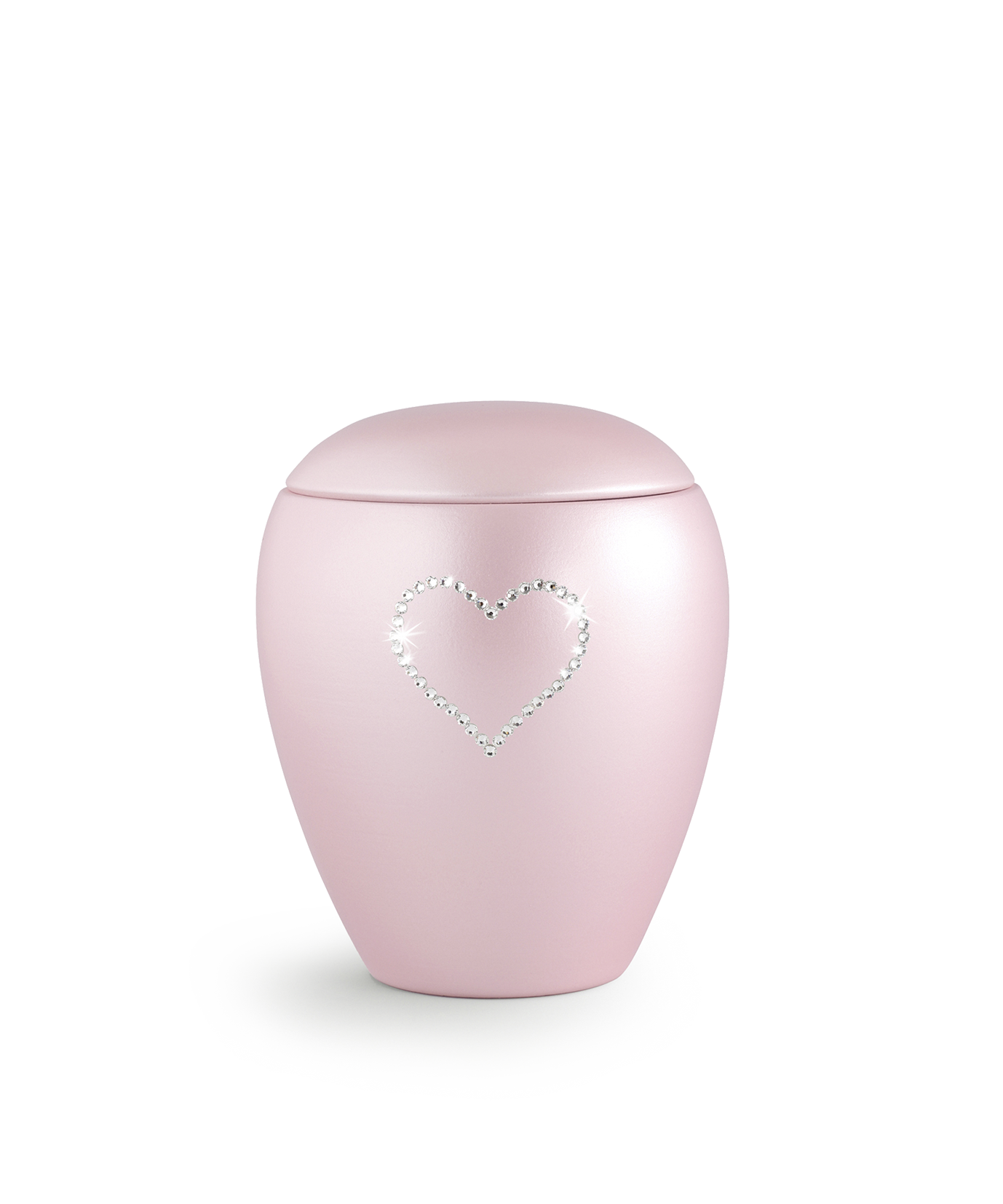 Die rosé Urne der Edition Crystal besitzt eine perlmuttschillernde Oberfläche. Das Herz-Motiv besteht aus hochwertigen Swarovski-Kristallen und wurde einzeln von Hand aufgebracht.