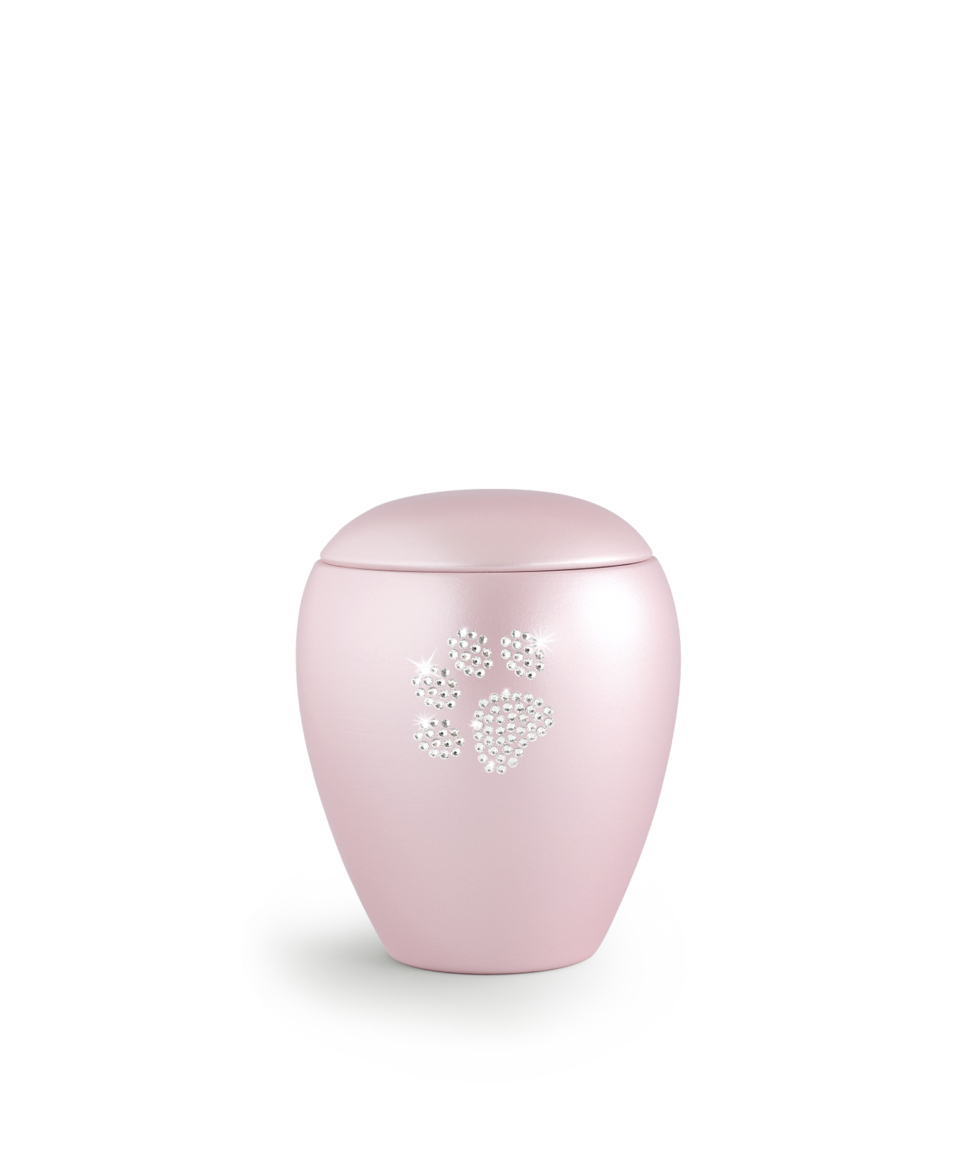 Diese Urne der Edition Crystal besitzt eine perlmuttschillernde Oberfläche. Das Pfoten-Motiv besteht aus hochwertigen Swarovski-Kristallen und wurde einzeln von Hand aufgebracht.