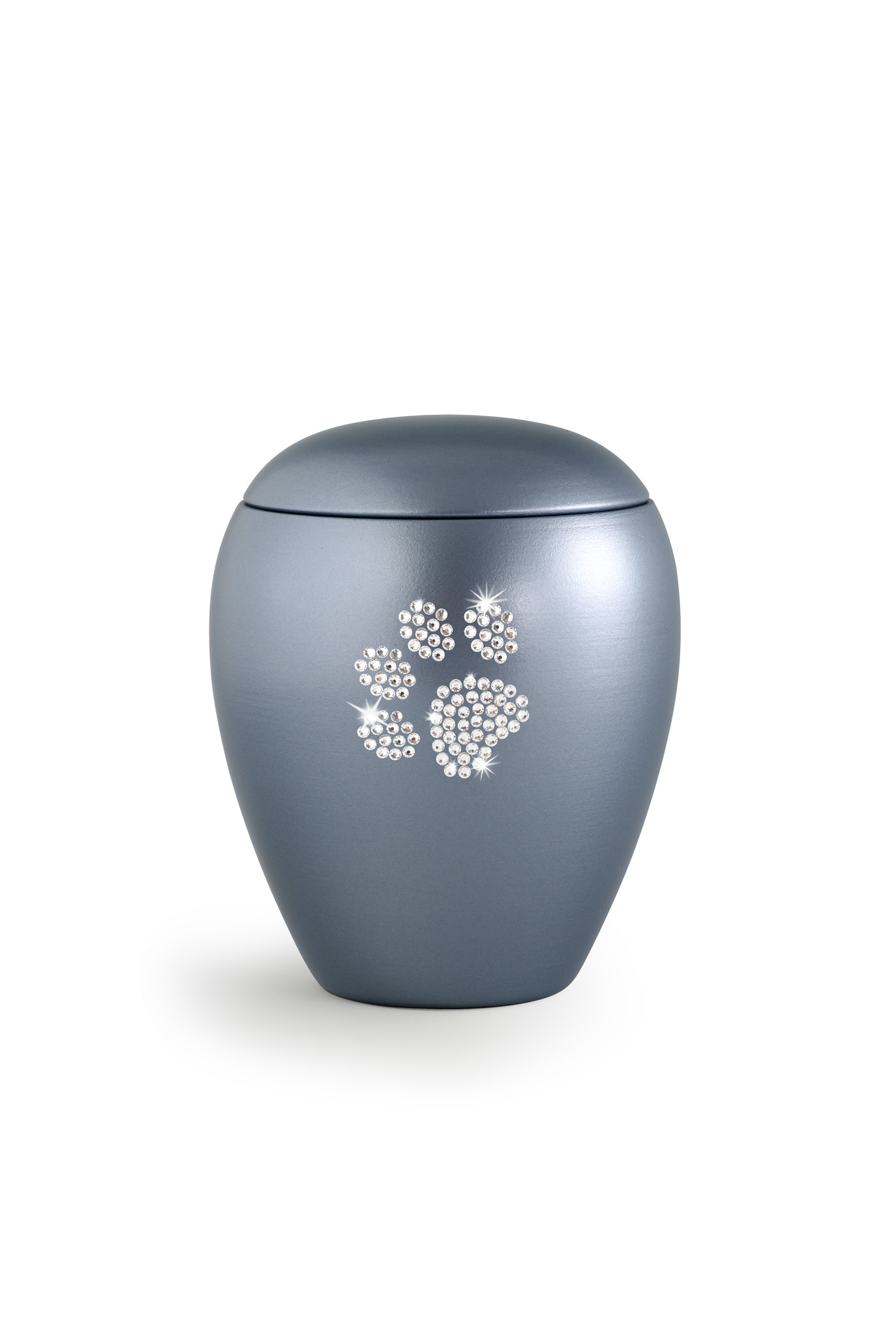 Die stahlgraue Urne der Edition Crystal besitzt eine perlmuttschillernde Oberfläche. Das Pfoten-Motiv besteht aus hochwertigen Swarovski-Kristallen und wurde einzeln von Hand aufgebracht.