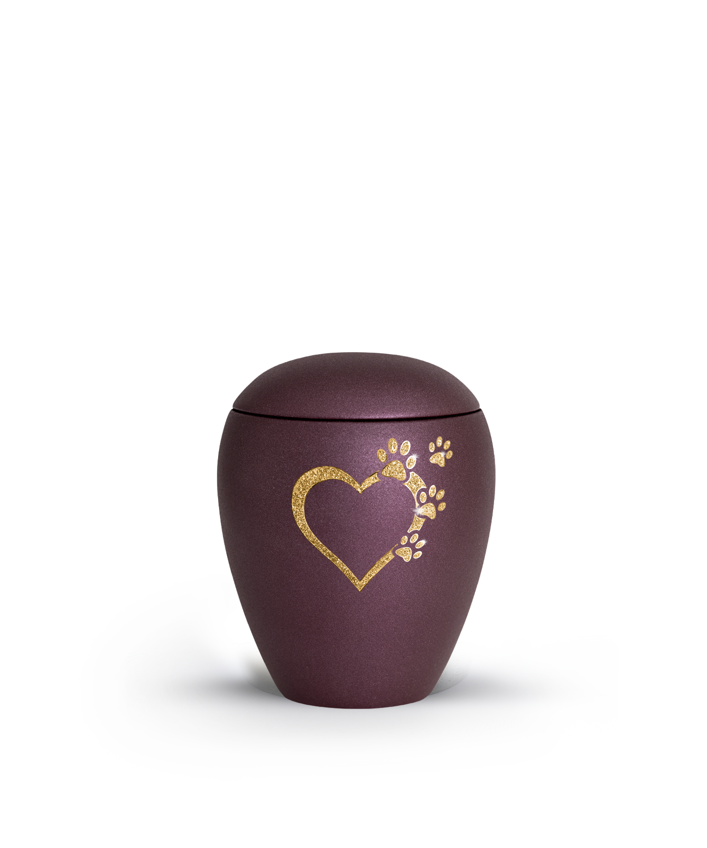 Diese berry, schimmernde Keramik-Urne ist mit dem goldenen Sparkling-Star-Motiv "HERZ MIT PFOTEN" verziert.