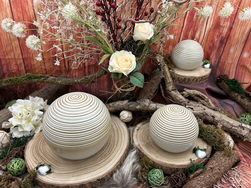 Kugelförmige Keramik-Außenbereichsurne mit Lebensspirale.