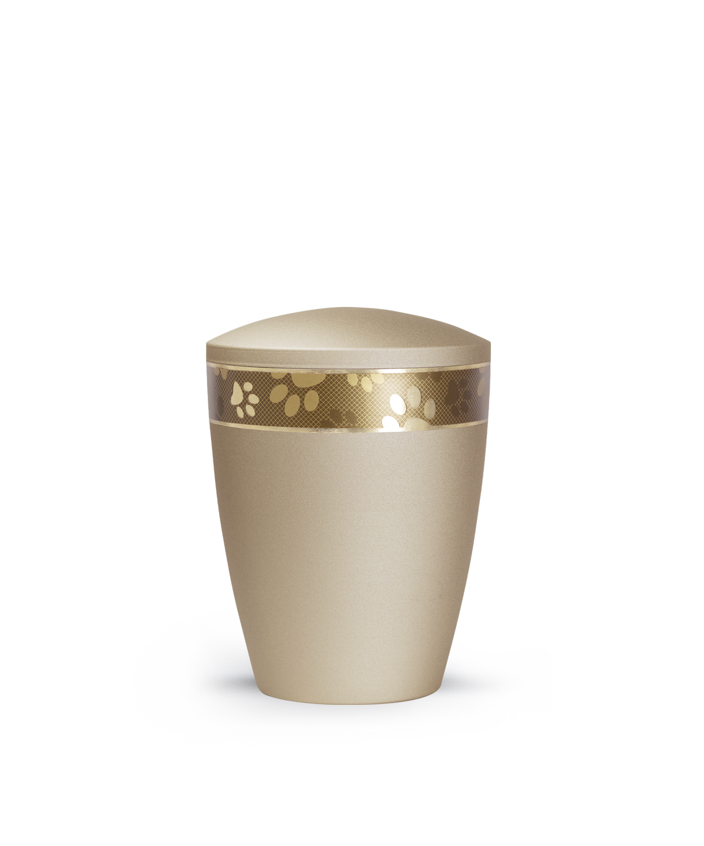 Die Urne ist mit einem Pfotenzierband verziert, welches von gold glänzenden Streifen eingefasst wird.