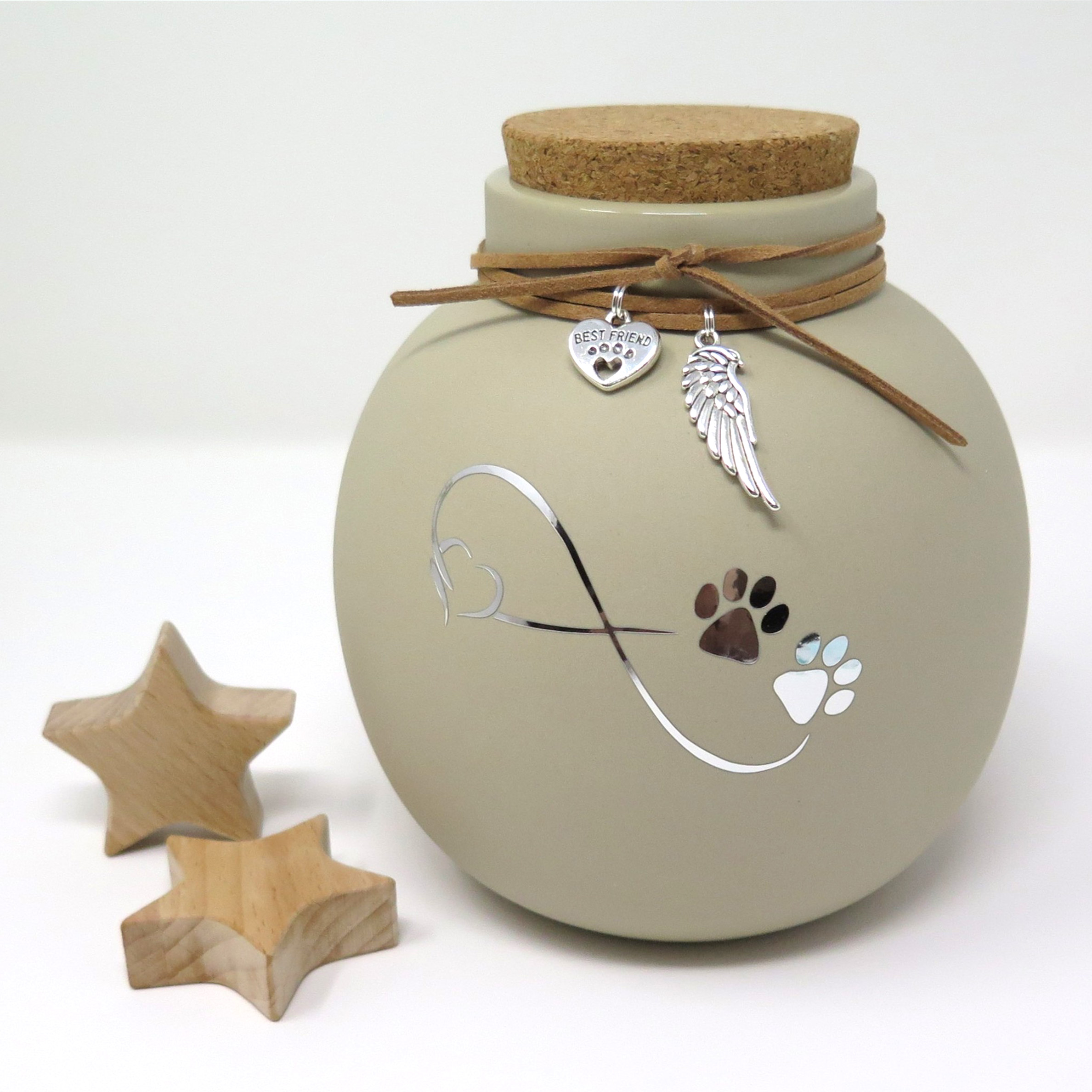 Diese süße handgefertigte Keramik-Urne ist mit einem Infinity-Symbol aus hochwertiger Edelfolierung und mit 2 Anhängern veredelt.
