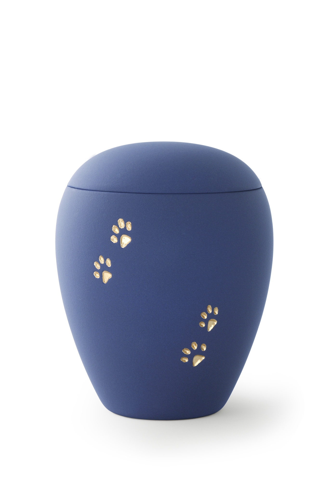 Die samtene, blaue Oberfläche der Urne ist mit von Hand bemalten, gold-glänzenden, vertieften Pfötchen verziert.