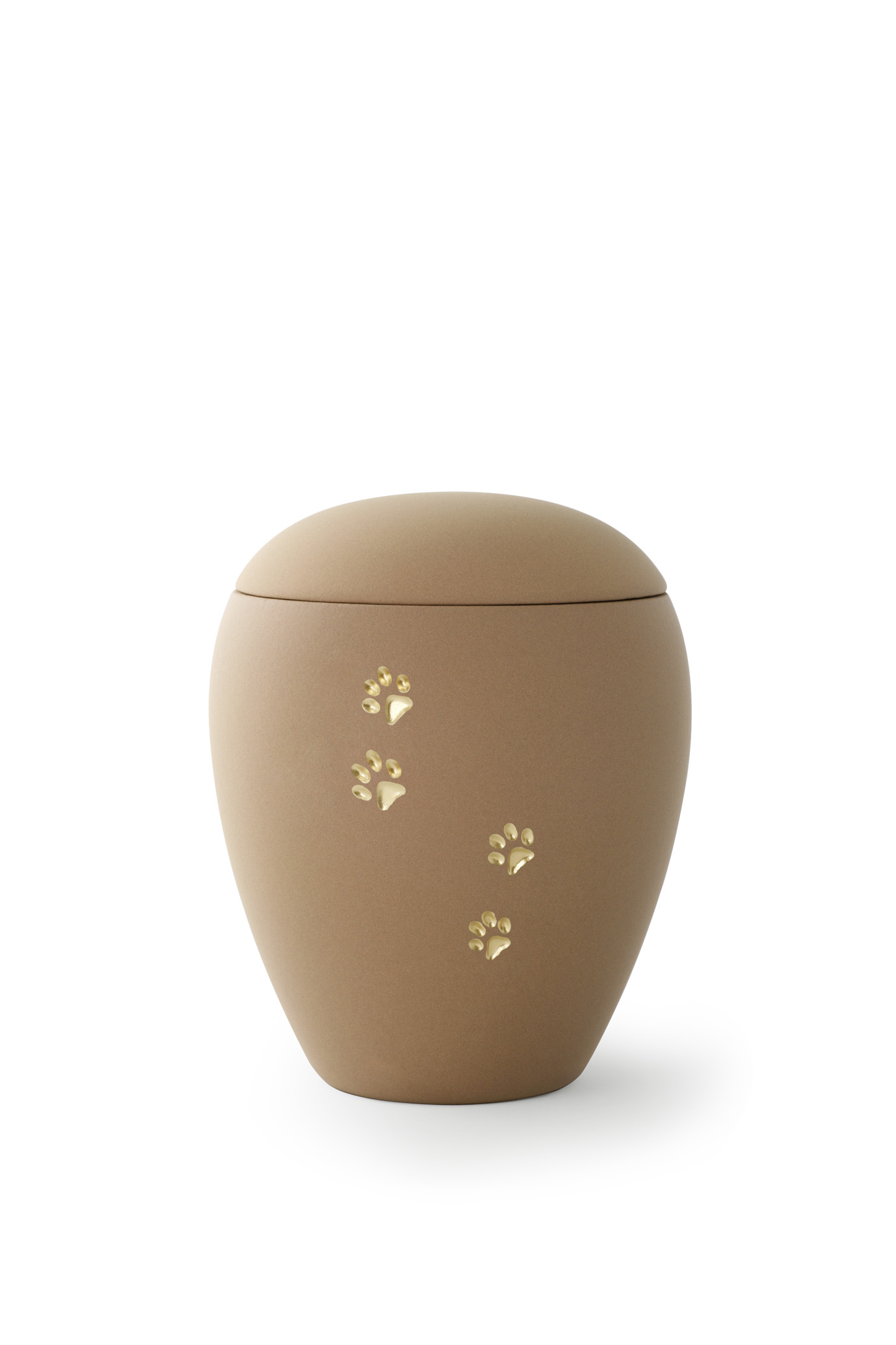 Die samtene braune Oberfläche der Urne ist mit von Hand bemalten, gold-glänzenden, vertieften Pfötchen verziert.