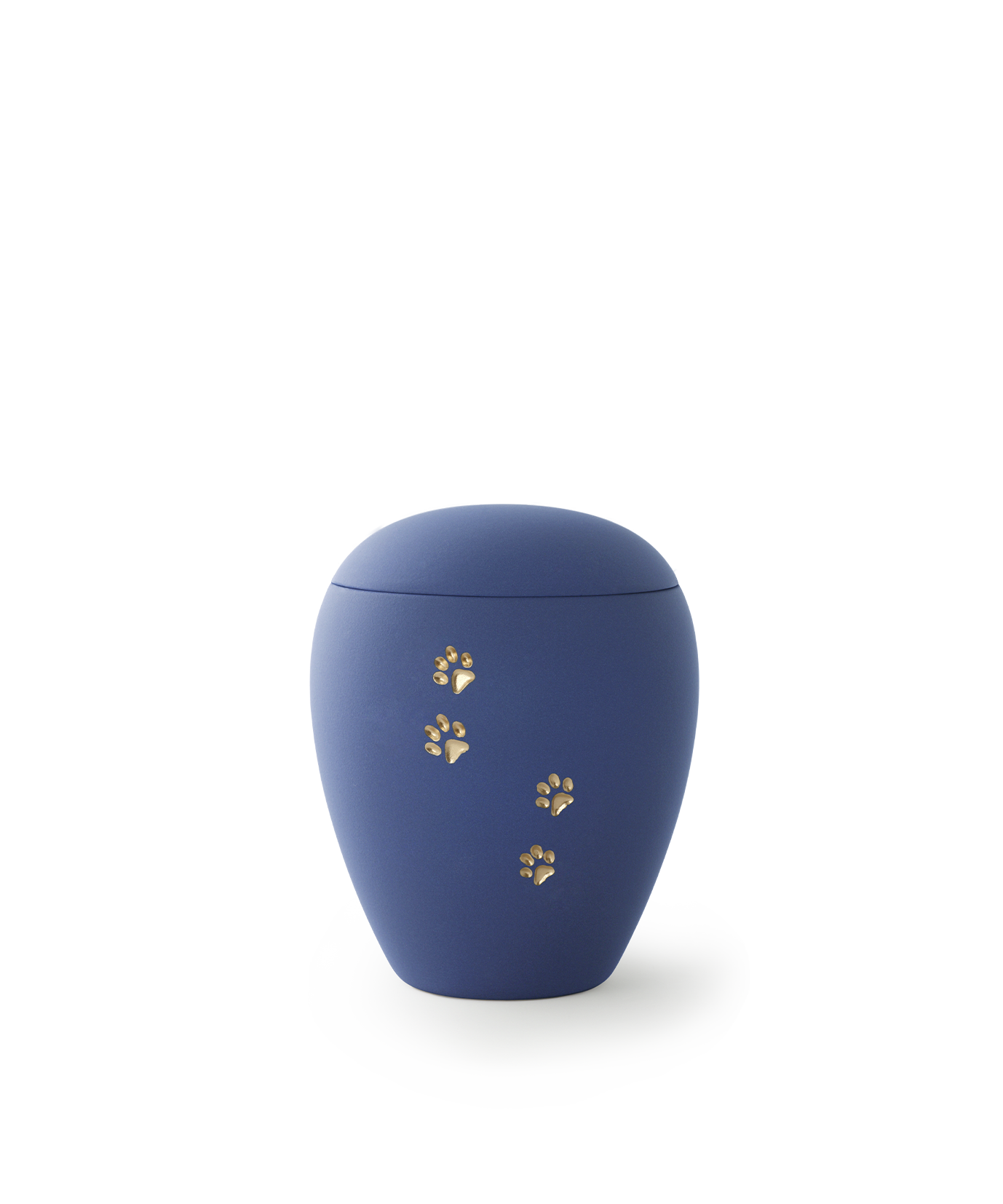 Die elegante, samtene, dunkelblaue Oberfläche der Urne ist mit von Hand bemalten, gold-glänzenden, vertieften Pfötchen verziert.