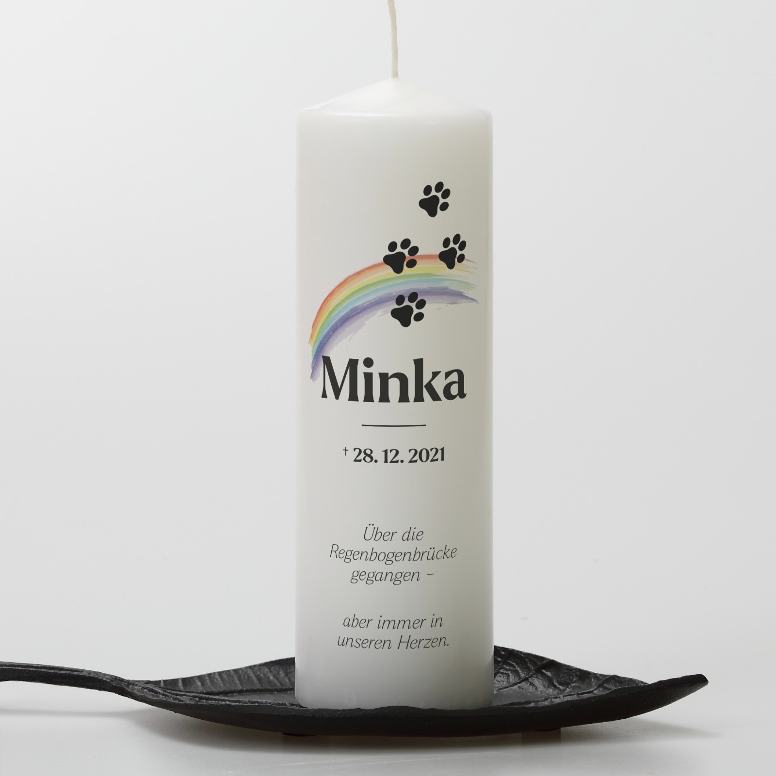 Bei dieser Trauerkerze mit dem Regenbogen kanns du aus diesen 3 Vorlagen einen Spruch für Deine Kerze auswählen: