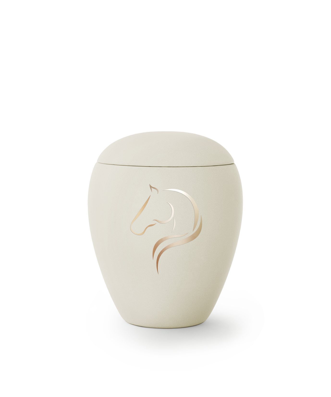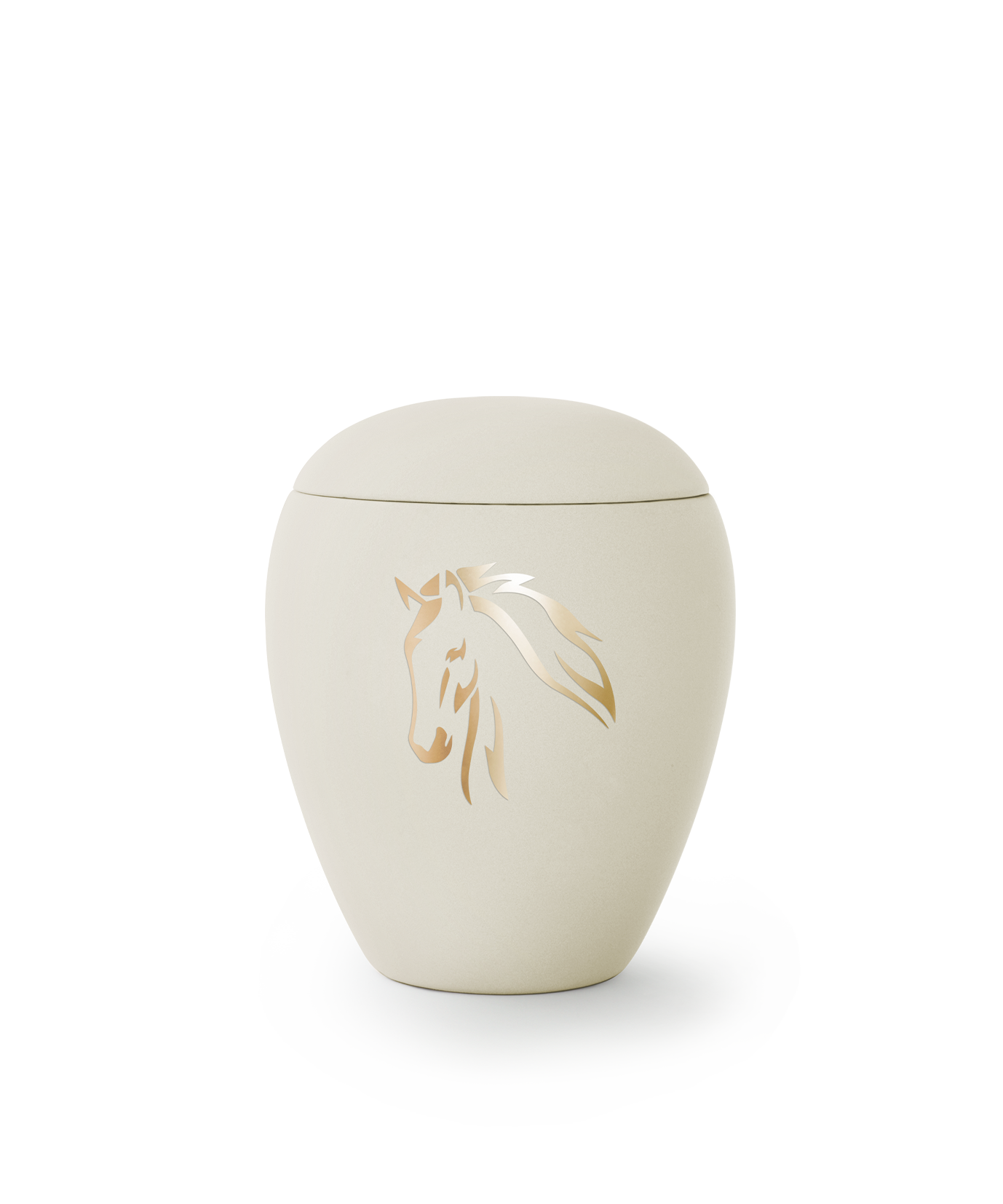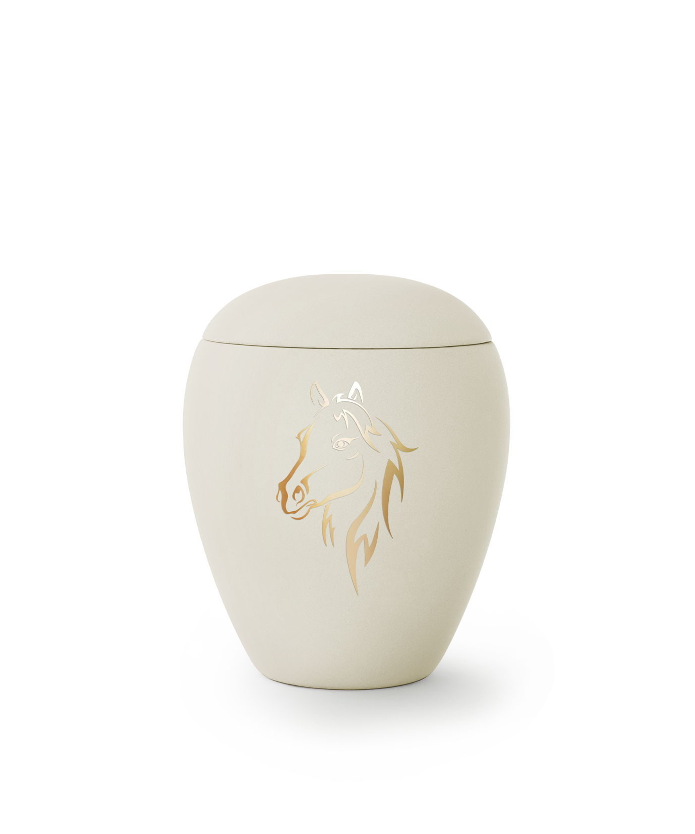 Die 1,5 Liter Keramik-Urne besitzt eine samtene Oberfläche und ist mit einem goldenen Motivbild eines Pferdekopfes verziert. Es gibt 3 Motivbild-Ausführungen (P1, P2, P3) zur Auswahl.